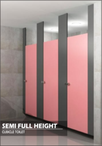 Cubicle Toilet Semi Full Height menawarkan privasi lebih tinggi dibandingkan dengan model standar, dengan bagian bawah yang tetap terbuka. Desain ini ideal untuk ruang publik di mana privasi penting, namun sirkulasi udara tetap diperhatikan. Memberikan keseimbangan antara kenyamanan dan aksesibilitas, cocok untuk area dengan lalu lintas pengguna yang tinggi.